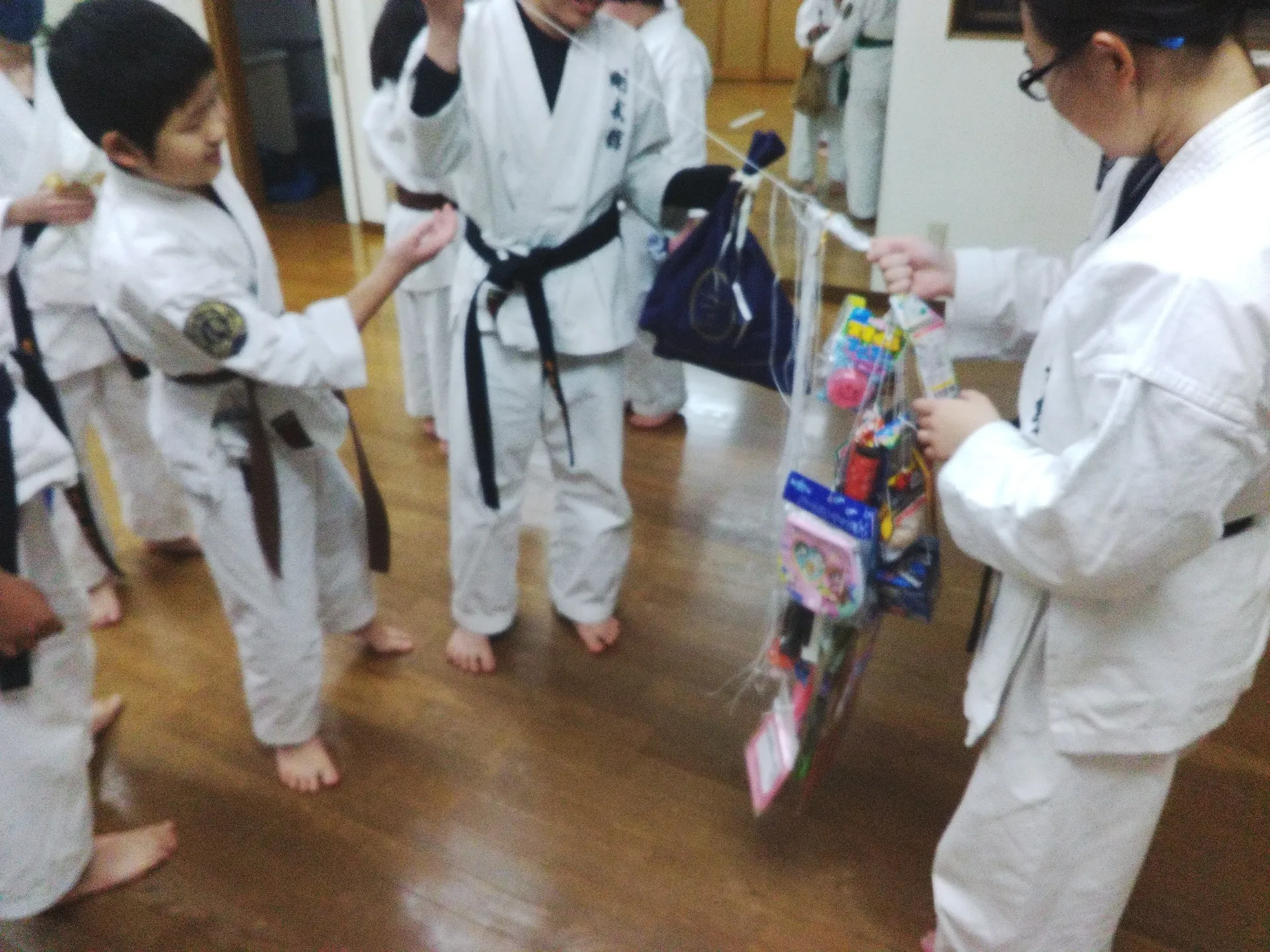 本部道場の納会稽古は、12月26日.27日に分けて納会稽古を行いました。 道場の電気を消し四隅に蝋燭を立て厳粛に神前に向かい二人ずつ型を奉納を行った後にプレゼント交換とお楽しみ会を行い今年の稽古を無事終了しました。